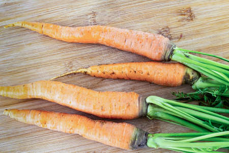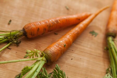 Freshly grown carrots on wooden table