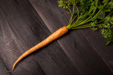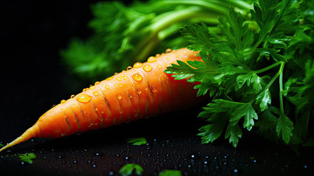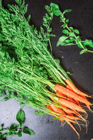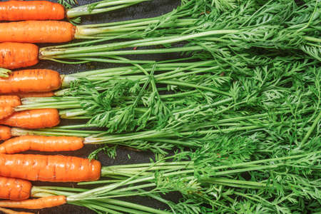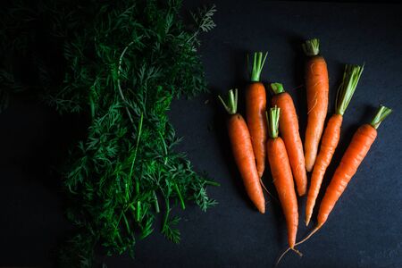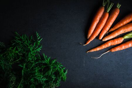 Bunch of fresh sweet orange carrots with green herbs on dark black background. Amazing pic of seasonal vegetable. Healthy lifestyle, vegan and vegetable food concept. Vitamin A.