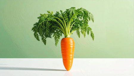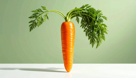 A single, vibrant orange carrot stands tall against a clean, pale green background. Its lush green tops suggest peak freshness, embodying concepts of healthy eating, simplicity, and natural vitality.