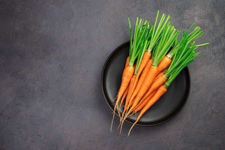 Young carrots in a plate on a gray background. Top view, copy space.