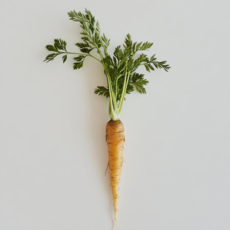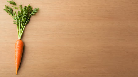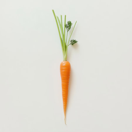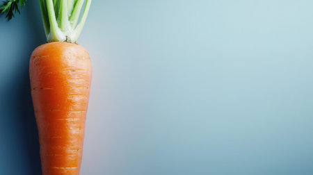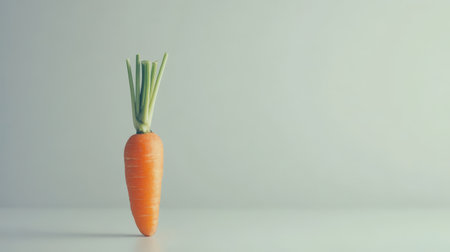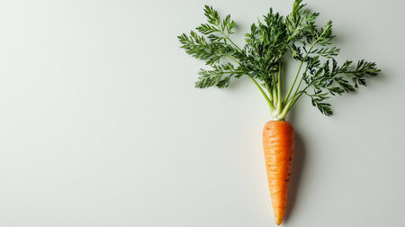 A vibrant orange carrot with fresh green leaves rests on a neutral background. Highlighting its organic shape, this carrot represents healthy produce often found in gardens or markets.
