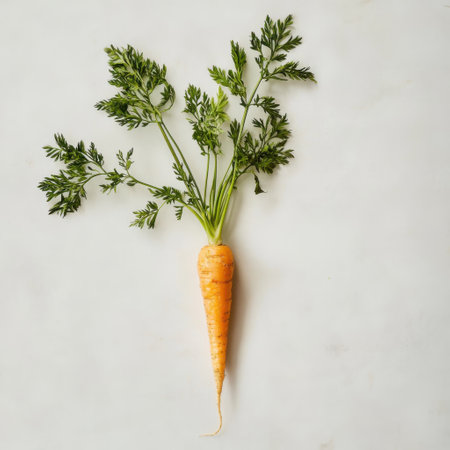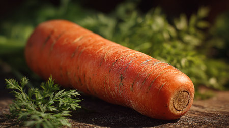 Freshly harvested orange carrot with vibrant green stems rests on a light surface. Its smooth texture and bright hue highlight the freshness and nutritional value of this vegetable.