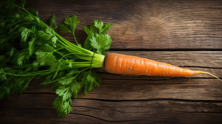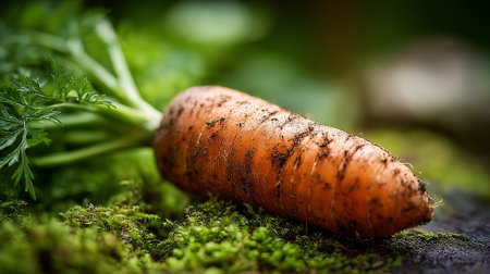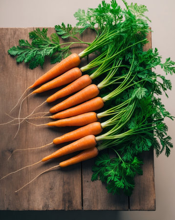 Freshly harvested carrots with vibrant green tops are artfully arranged on a rustic wooden table. Dirt clings to the roots, highlighting the connection to nature's soil.