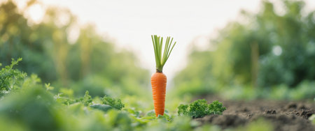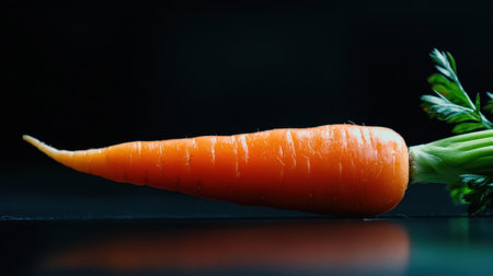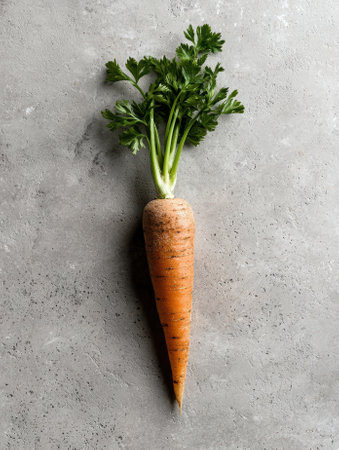 Single fresh organic carrot with bright green leaves, perfect for healthy food images, cooking inspiration, and dietary lifestyle concepts.