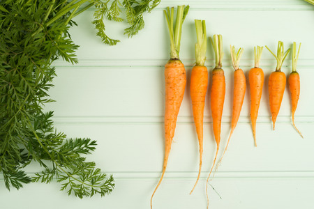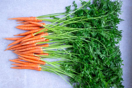 Bunch of young carrots with green tops on white wooden vintage table, healthy food on mock up background top view, diet and vegetarian orange vegetable; vitamin agriculture concept