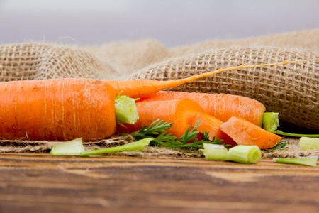 carrots with leaf on burlap and wooden board