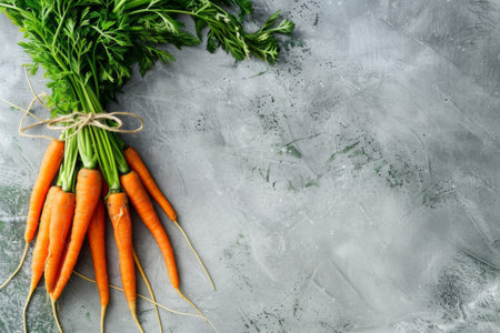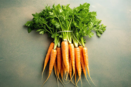 Vibrant bunch of carrots with green tops on a teal textured backdrop