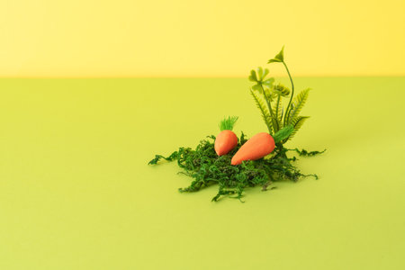 Carrot on pastel blue and yellow background. Minimal raw food concept. Spring minimal composition. Copy space