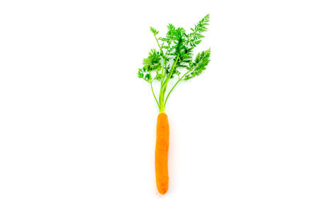 One ripe fresh carrot with leaves isolated on white background. Closeup image of ideal vegetable, healthy natural organic food