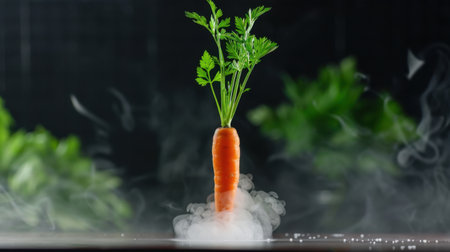 A stunning visual of a carrot floating above a textured rock surface with vibrant green leaves, set against a dreamy, colorful background, perfect for food and garden themes.