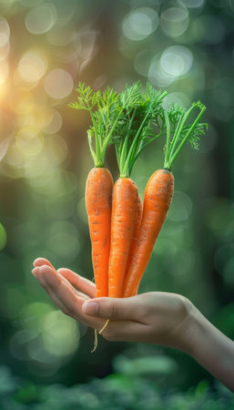 Fresh carrots held in hand with blurred background, ideal for adding text or captions