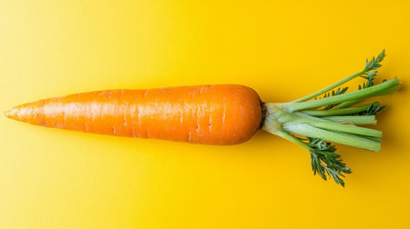 Single, vibrant orange carrot with rough texture, isolated on a bright yellow background, concept.