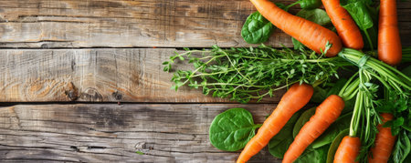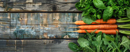 Fresh carrots, spinach, and herbs displayed on reclaimed wooden planks. The natural colors of the vegetables pop against the weathered wood.