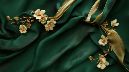 A beautiful arrangement featuring delicate flowers and luxurious fabric in rich green and gold tones, perfect for weddings and elegant decor.