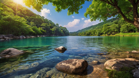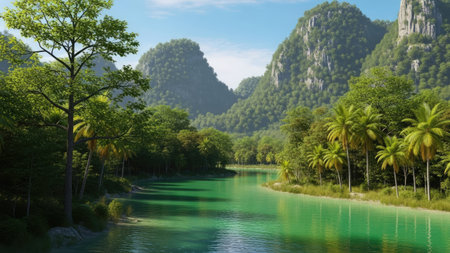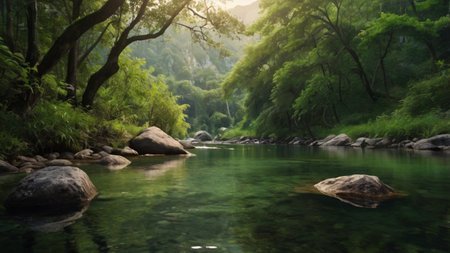 Serene Jungle Landscape with Clear River Surrounded by Lush Green Trees and Natural Beauty in Tranquil Wilderness Setting