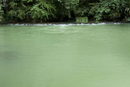 Bird eye view of amazing blooming algae on green river. Earth day concept.