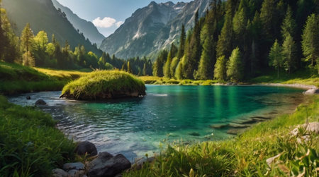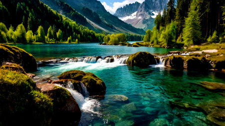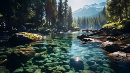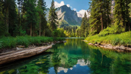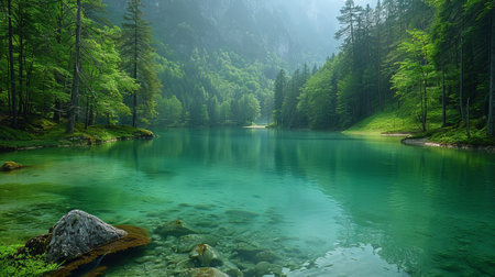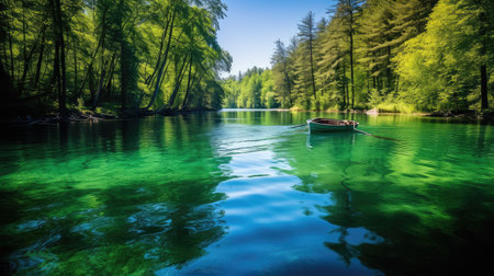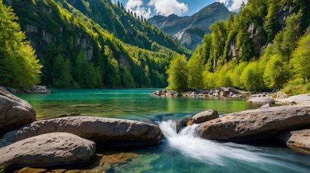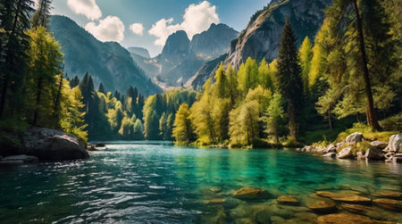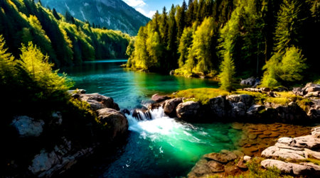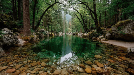 a photo of a treelined river in the forest, showcasing a captivating blend of dark emerald and light azure hues. the image captures the serene simplicity and rustic charm of the swiss style, with reflections and mirroring adding a touch of hazy romanticism. this enchanting scene exudes a forestpunk vibe, inviting viewers to immerse themselves in its natural beauty. ai generated