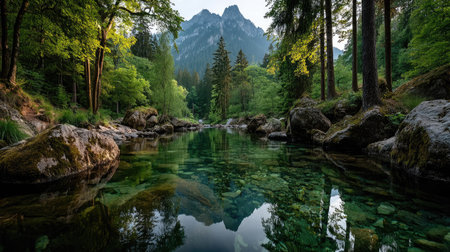 Tranquil water flows gently through a dense woodland, framed by vibrant mountain foliage that radiates vitality and peace in a pristine natural setting.
