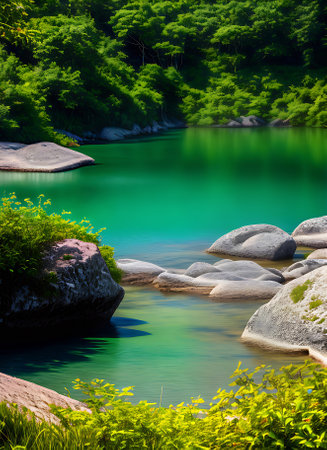 A picturesque river displays crystal clarity with vibrant green hues, surrounded by lush vegetation, colorful rocks, and the serene reflection of trees creating a tranquil natural ambiance.