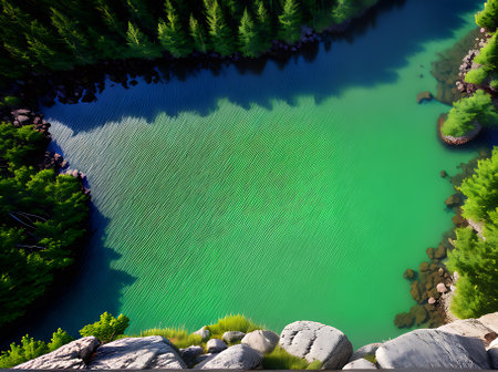 River viewed from above surrounded by coniferous trees captured in a vivid Kodachrome color palette depicted through a drawing. Generative AI Generated