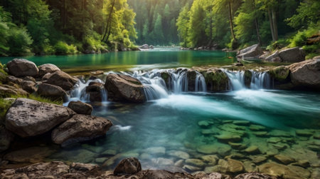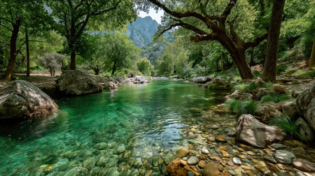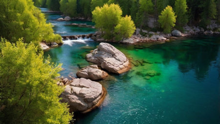 Experience a peaceful river landscape featuring crystal clear turquoise water set against smooth stones and lush green trees, perfect for nature lovers and explorers.
