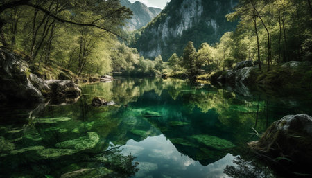 Tranquil scene of majestic mountain peak reflected in flowing water generated by artificial intelligence