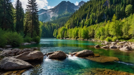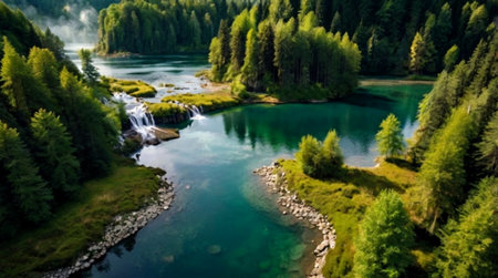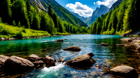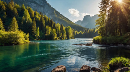 A wild river winds through a lush forest of trees, rocks, and plants, creating a breathtaking landscape that captures the essence of nature's beauty
