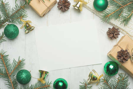 Christmas greeting card. Festive decoration on green background. New Year concept. Copy space. Flat lay. Top view.