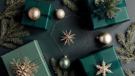 beautifully arranged flat lay features green gift boxes adorned with decorations surrounded by pine branches and Christmas ornaments perfect for festive occasions.