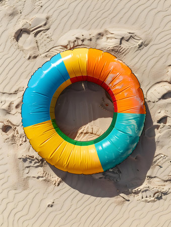 Top view of a multicolor inflatable swimming ring on the beach