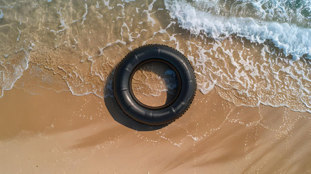 Top view of a black inflatable swimming ring on the beach