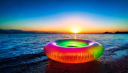 Neon inflatable circle resting in the tranquil pool at sunset