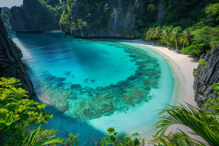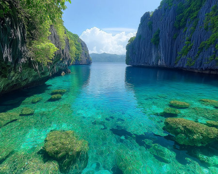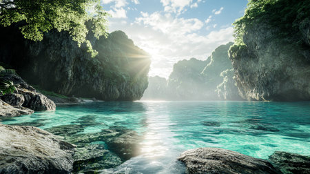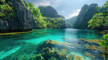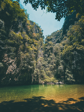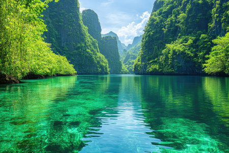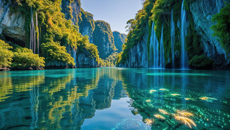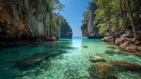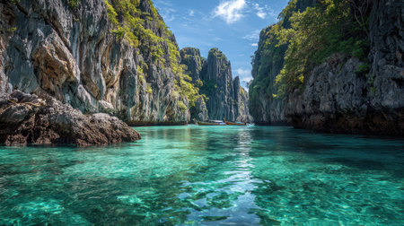Serene tropical scene showing towering cliffs and lush greenery surrounding tranquil turquoise waters. ideal for travel inspiration, relaxation themes, and exotic getaway promotions.