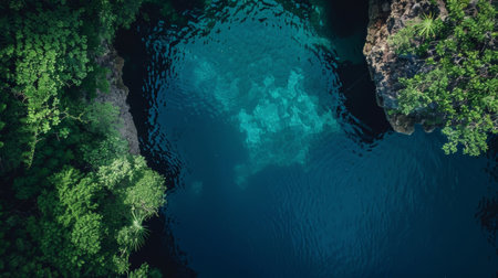 Experience the tranquil beauty of a remote tropical water body framed by vibrant green foliage, creating a serene and peaceful nature escape.