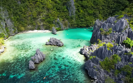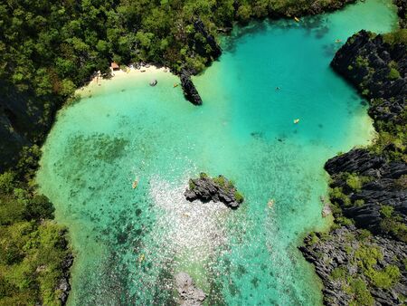 Palawan, Philippines aerial drone view of turquoise lagoon and limestone cliffs. El Nido Marine Reserve Park