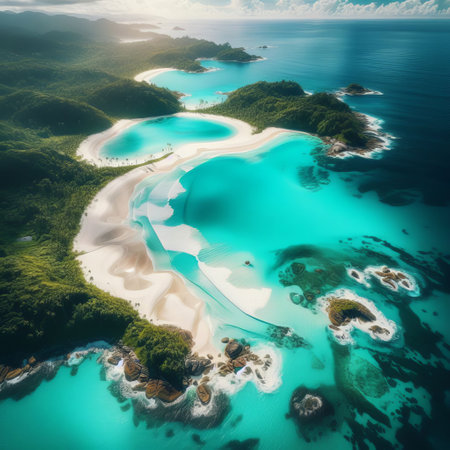 An idyllic aerial view of a tropical beach and lagoon with clear turquoise waters, white sandy shores, and surrounding greenery. Perfect for depicting paradise, relaxation, and exotic travel destinations.. AI Generation