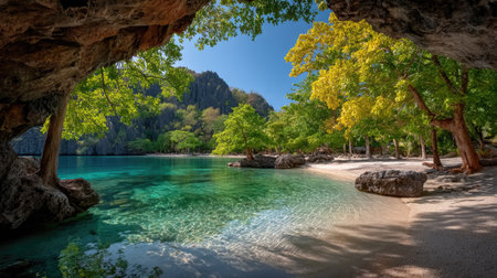 This beautiful image captures a tranquil tropical beach surrounded by rocky cliffs and vibrant greenery. Ideal for relaxation and exploration, nature's paradise awaits.