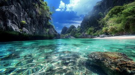 Hidden Lagoon with Rugged Cliffs and Clear Blue Waters Surrounded by Lush Greenery. Concept of Nature's Beauty, Serenity, Adventure, and Exploration in a Pristine Tropical Setting. Background. Wallpaper.