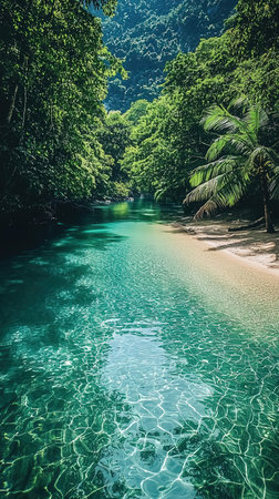 Sunlight reflecting on the surface of a translucent turquoise river flowing through a tropical forest