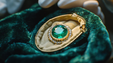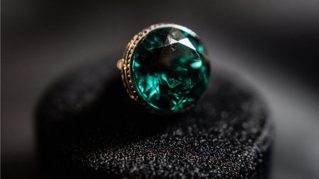 A stunning green gemstone captures attention with its brilliant sparkle, resting elegantly on a soft velvet surface, enhanced by a gentle bokeh background.