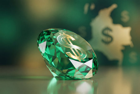 A faceted green emerald sits on a reflective surface displaying a bright golden dollar symbol on its front face while a blurred map of colombia floats in the dark green background representing trade.