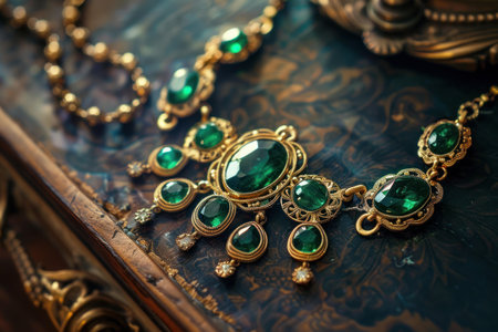 Elegant antique emerald necklace displayed on a wooden vintage dressing table