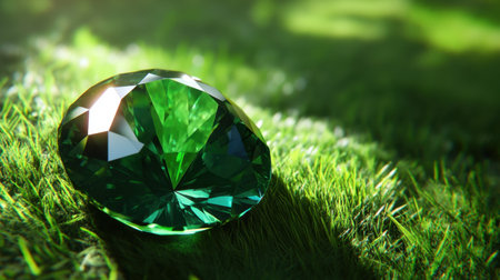 A stunning emerald gemstone rests on a patch of lush green grass, illuminated by soft sunlight, showcasing its brilliant cut and vibrant color.