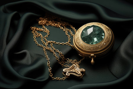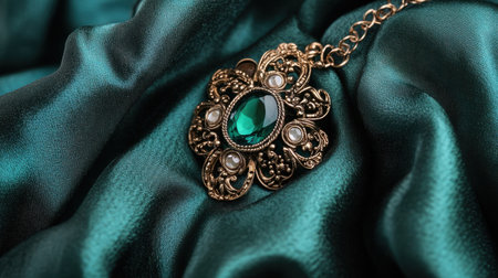 This enchanting vintage gold pendant features an emerald gemstone surrounded by pearls, elegantly draped on lush emerald silk fabric, perfect for fashion enthusiasts.