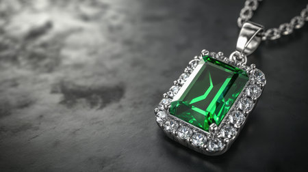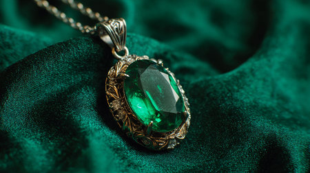 A stunning green gemstone pendant necklace rests elegantly on soft satin, showcasing its luxurious shine and intricate design, perfect for jewelry enthusiasts and fashion lovers.