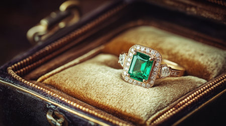 This stunning emerald ring is beautifully accented with sparkling diamonds, showcased in a luxurious vintage jewelry box, perfect for special occasions.