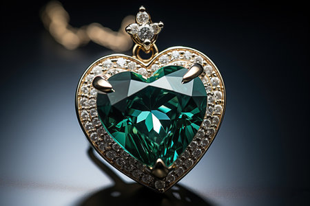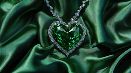 A stunning heart-shaped emerald pendant adorned with sparkling diamonds, resting on a beautifully draped green silk fabric, embodying luxury and elegance.