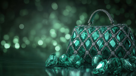 A stunning emerald handbag surrounded by sparkling gemstones, set against a shimmering bokeh background, capturing the essence of luxury and style.