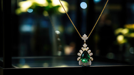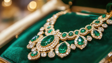 This stunning piece features a luxurious emerald and diamond necklace, elegantly displayed to highlight its intricate design and captivating beauty, perfect for any occasion.