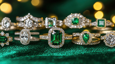 A stunning display of vintage-inspired rings featuring green and white gemstones, perfect for any special occasion or as a stylish accessory.